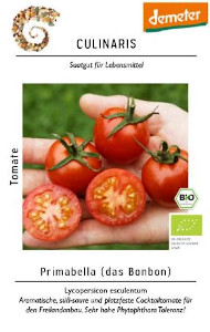 Die Freilandtomate Primabella hat feste, lagerfähige kräftig-rote Früchte, die in Rispen hängen. Sie ist ertragreich und besonders robust bei gutem süß-saurem Aroma. Die etwa 30 g schweren Früchte eignen sich besonders zum Frischverzehr.