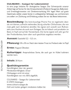 Sie ist hübsch und produktiv im Beet und im Topf. Die Sorte eignet sich sehr gut für den Freilandanbau, kann aber auch geschützt angebaut werden. Prairie Fire wurde in einer zweijährigen Sichtung aus über 50 Capsicum-Sorten auf ihre Eignung für die Kultivierung unter Low-Input-Bedingungen in Töpfen und im Freiland getestet.
