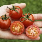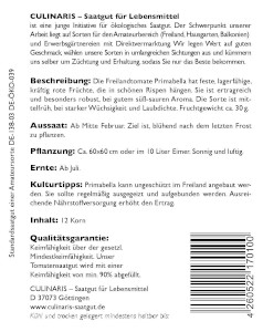 Die Freilandtomate Primabella hat feste, lagerfähige kräftig-rote Früchte, die in Rispen hängen. Sie ist ertragreich und besonders robust bei gutem süß-saurem Aroma. Die etwa 30 g schweren Früchte eignen sich besonders zum Frischverzehr.